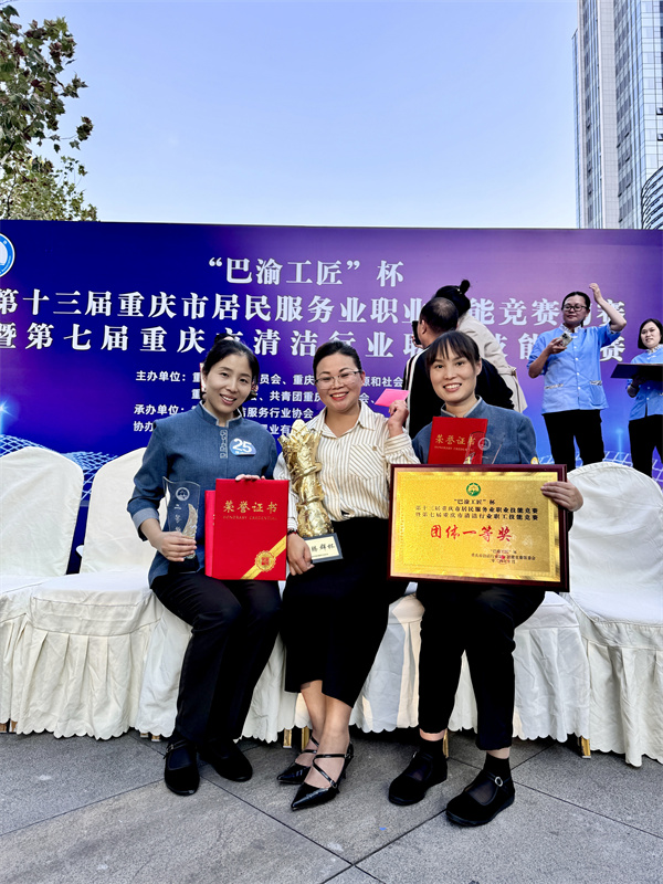 喜讯!!!重庆山城清洗技术服务有限公司分别荣获“巴渝工匠”杯第十三届重庆居民服务业职业技能竞赛暨第七届重庆市清洁行业职工技能竞赛团体一等奖、个人赛一二等奖。我司参赛人员在激烈竞争中脱颖而出,充分展现了我司优秀保洁人员的卓越风采。